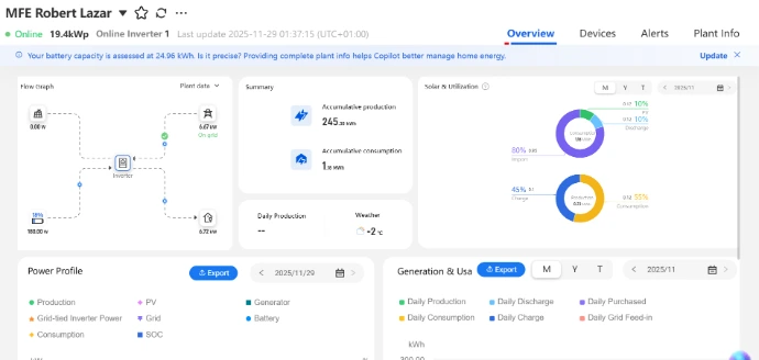 Pregled sistema – hibridni razsmernik DEYE HP20 + 25 modulov + 24,54 kWh baterije