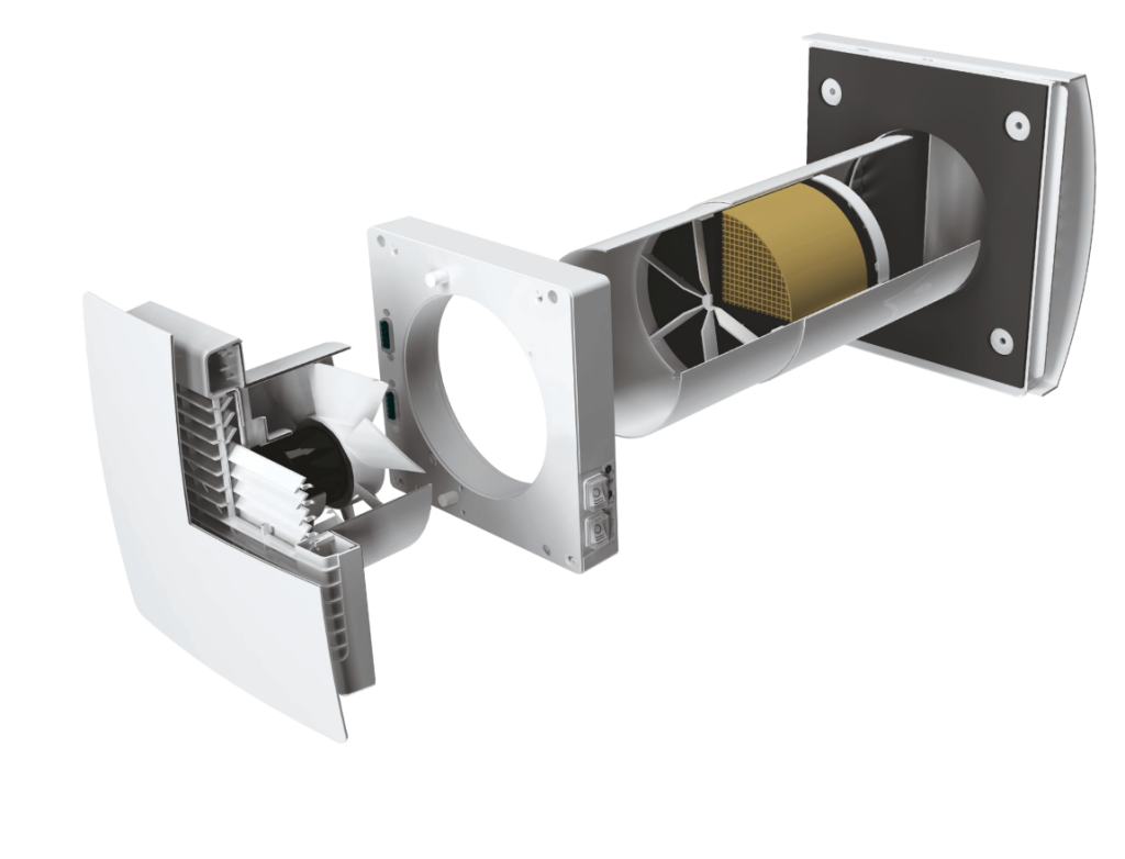 Lokalni prezračevalni sistemi so presenetljivo kompleksne naprave, čeprav so po videzu kompaktni in diskretni. V podjetju Solven Energija d.o.o. so vgrajeni v odprtino premera 100 ali 160 mm skozi zunanjo steno in vsebujejo: